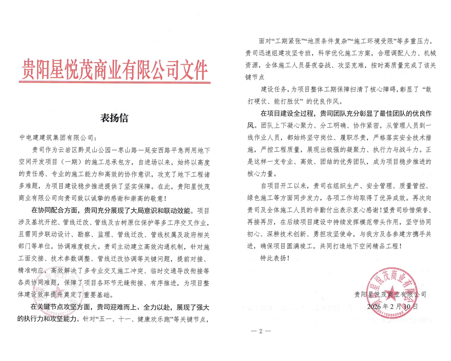近日,黔灵山公园地下空间一期项目圆满完成“全幅恢复通行”关键节点目标,公园广场、枣山路及北京西路已正式全面恢复通行。项目团队收到建设方发来的表扬信,并获得“攻坚克难先进单位”称号,以实际行动为市民游客送上暖心的新春贺礼,也为公司交上满意答卷。 黔灵山公园地下空间一期项目作为贵阳市重点工程,地处公园核心出入口,承载地下商业开发与交通优化双重功能。施工期间,该项目客流密集、市区主干道交通组织难度大,涉及古树、景区大门及高架桥桥墩、穿地铁轨行区上空等多重保护要求,老城区管线迁改与原位保护亦同步推进,施工区域受限、场地狭小,需分幅分段分块组织施工。 为确保按期恢复通行,项目团队科学制定并持续优化专项施工方案,统筹交叉作业,精准调配人、材、机等资源,严守安全与质量底线,最终如期实现全幅恢复通行目标。针对节假日高峰,项目团队在客流与车流组织原有基础上重新导改,进行专门优化,大幅提升游客入园效率及周边居民出行体验,有效缓解区域交通压力。 建设方在表扬信中对项目团队给予充分肯定,指出团队始终坚守岗位、履职尽责,严控安全质量,展现出强大的凝聚力、执行力与战斗力,是一支专业、高效、团结的优秀队伍。下一步,项目团队将继续保持攻坚姿态,高标准推进后续施工,确保按期竣工交付,为完善城市功能、提升市民出行体验、助力区域经济发展贡献更多电建力量。 | ||||